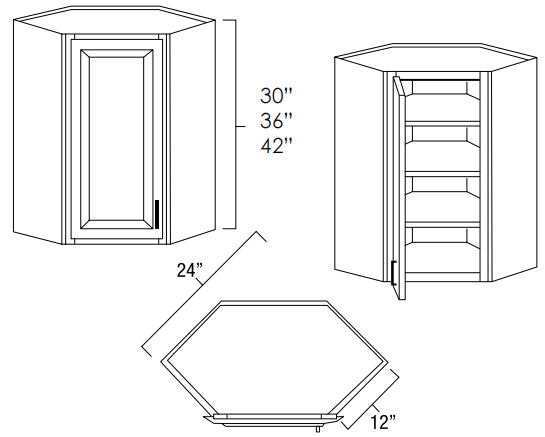 Castle Grey - Diagonal Corner Wall Cabinets. It Measures 24"W X 42"H With 3 Shelves. Door May Be Replaced With Corresponding Diagonal Glass Door.