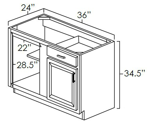 Magnolia Shaker - Blind Corner Base Unit. It Measures 36"W X 24"D X 34.5"H May Be Used As Right Or Left Set Up. Adjustable To 45" Wide. May Not Be Pulled Farther Than 9". 12 7/8" Door Overlays 11 7/8" Frame Opening. Full Overlay Cabinets Must Be Pulled A Minimum Of 4" And Remaining Styles Must Be Pulled A Minimum Of 3". May Be Necessary To Pull Further To Allow Clearance For Door And Drawer Hardware.