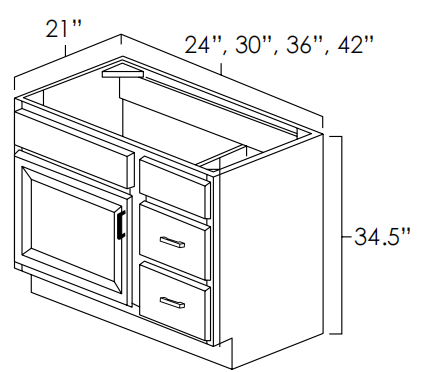 Seaside White - Single Door Vanity Cabinets 30"W X 21"D X 34.5"H With Drawer. When Indicating Right (R) Or Left (L), It Corresponds To The Side The Drawers Are On While Looking At It. There Are No Shelves In These Cabinets.