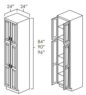 Seaside White - Universal Oven Cabinets. It Measures 33"W X 24"D X 84"H. The cut out opening measures 28.5" x 22". Will fit any standard size oven. These cabinets are 24" deep. Can be arranged as a single oven, double oven, or oven/microwave combination by removing the necessary drawers and cutting to fit. Butt doors on all universal oven cabinets. The top two drawers are standard drawers while the bottom is a deeper drawer.